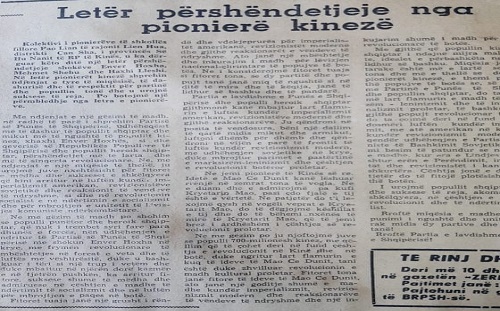 1966. Nga ky dossier po faktojmë letrën, që kolektivi i pionierëve të shkollës fillore Pao Lian të rajonit Lien Hua, distrikti Can Sha i provincës Hu Nanit të RP të Kinës u ka dërguar një letër përshëndetje shkruan shtypi i kohës, Enver Hoxhës, Mehmet Shehut, Haxhi Lleshit...