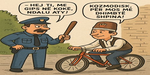Shqiptari plisbardh n’Beograd me një zaman,kalonte me biçikletë parkut në “Kalemegdan”.Një ditë e pret polici me shkop gome në dorë,e kërcënon, e fyen, e rrah shpinës për disa orë. Përsëri: - Hej ti, me gips në kokë, ndalu aty!Vazhdonte polici ta ndalte shqiptarin hallexhi.Ai, nuk reagonte, heshte pa...