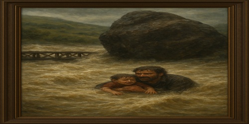 Pas një stuhije përzier me shi që zgjati pak minuta, ujrat e gjolit u rrëkllyen edhe disa herë me radhë nga veriu në jugë dhe nga jugu në veri, gjersa gjetën drejtpeshimin e natyrshëm dhe ranë përsëri në plogështinë e shtratit të kënetës. Babai hapi me vrullë derën e barakës të sapo....