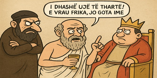 Një mjek xheloz, si sorrë me sqep,pretendonte Sokratin ta fuste në grep.“S’mund, o Madhëri, ai të jetë i parë,unë jam më i zgjuar, më mendimtar! Sokrati s’vlen as për një kokërr sheqer,mbase jam i gatshëm ta sfidoj përherë!Do ta pimë helmin, kush shpëton, fiton,përjetësisht titullin e fitores le ta gëzon!”...