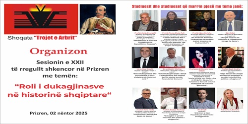 Shoqata "Trojet e Arbrit "ju fton që të merrni pjesë në sesionin e XXII-të, të rregullt shkencor me temën "Roli i dukagjinasve në historinë shqiptare ". Sesioni shkencor mbahët më datë, 02 nëntor 2025 në Shtëpinë e Kulturës "Xhemajli Berisha"në Prizren dhe fillon në ora 10:00. Në këtë sesion shkencor do të marrin pjesë studiuesit më...