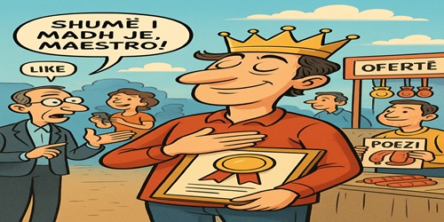 Në pazarin e madh të rrjeteve sociale,ku lavdia blihet me “like” pa ideale,artistët shëtisin me kurorën e zbehtë,me medalje plastike me çmim “ofertë”. Njëri shpallet gjeni në statusin e vet,tjetri e shet poezinë si sallam në paketë.Kritiku i rri mbrapa si papagall gojëtar,“Shumë i madh je, maestro!”- i paparë...