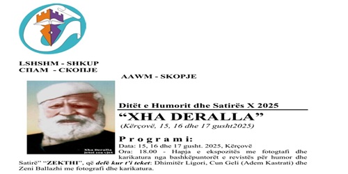 HOTEL “KËRÇOVA”, jeni i (e) ftuar të merrni pjesë në Manifestimin Kulturor Tradicional Ndërkombëtar: Ditët e Humorit dhe Satirës (X) “XHA DERALLA”. Vendi: Kërçovë Data: 15, 16. dhe 17 gusht 2025. Ora: 15.00 – 17.00, Akomodimi i poetëve në Hotelin “KËRÇOVA”, në Kërçovë. Ora...