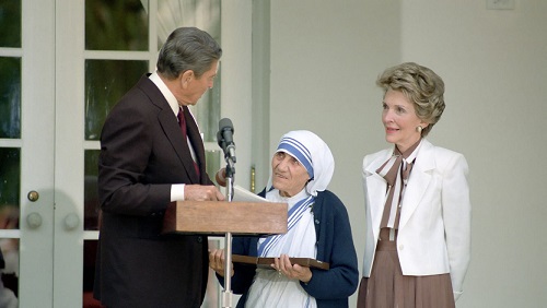 Në vitin 1985 presidenti amerikan Ronald Regan i jep Nënë Terezës Medaljen e Lirisë. Në fjalimin të cilin e mban me këtë rast, Regani bën një lapsus: i referohet Nënë Terezës si "bijë e Jugosllavisë". Shkaqet e këtij lapsusi janë krejt të qarta: Jugosllavia abuzonte me faktin se Nënë Tereza kishte lindur në Shkup...