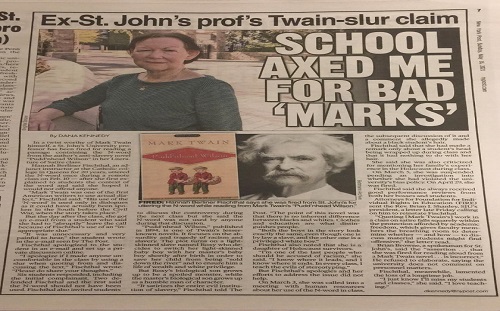 Profesoresha e Universitetit të Shën Gjonit, u pushua nga puna në Universitet pse kishte lexuar fragmente nga libri: “"Pudd'nhead Wilson", shkruar nga shkrimtari i famshëm amerikan i Mark Twain.[1]Pedagogia prof. Hannah Berliner Fischthal, tha se nuk ishte në dijeni...