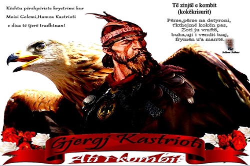 Ndër dy shpella të thella, nën dy harqe të daltuem në shkambijtë e ashpër të maleve tona, të naltuem e të zhytun deri në vrantësinën e pafund të qiellit, të ndamë nga një stom i drejtë që bie pingul mbi një kreshtë burrnore e ku nën té buroi si prroni i pastër e i freskët hymni i një Flamuri të dhunuem për shekuj me rradhë...