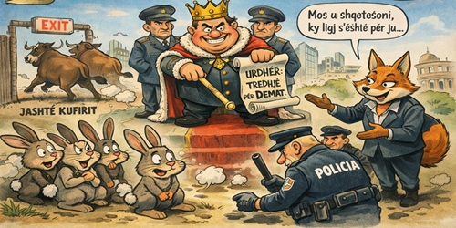 Një mbret, me mendjen teneqe,nxori dekretin me pasojë t’keqe:“Demat t’i tredhin, pa zhurmë,kërkon rendi, s’dua fjalë shumë!” Me të dëgjuar urdhrin mbretëror,me të katra na ikin demat e gjorë.Pas tyre vrapojnë lepujt me frikë,sy të zgurdulluar dhe veshët bigë...