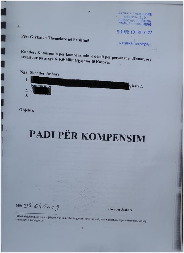 Padia për kompensim, e përbërë prej 420 faqesh dhe me mbi 2500 faqe dokumente që argumenton kërkesën e padisë, tashmë e futur në procedurë në Gjykatën Themelore në Prishtinë.