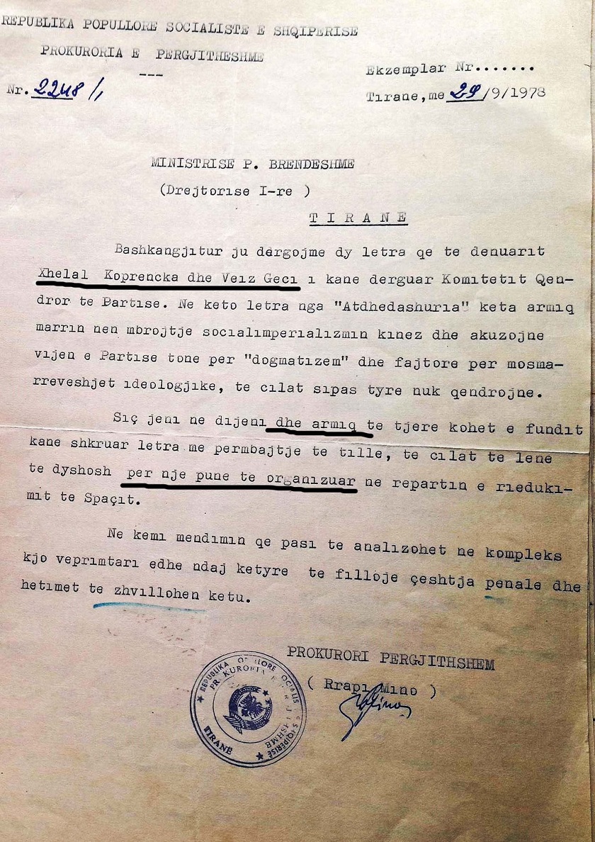 shkresën nr.2248, datë 29.9.1978 prokurori i përgjithshëm Rrapi Mino i dërgoi