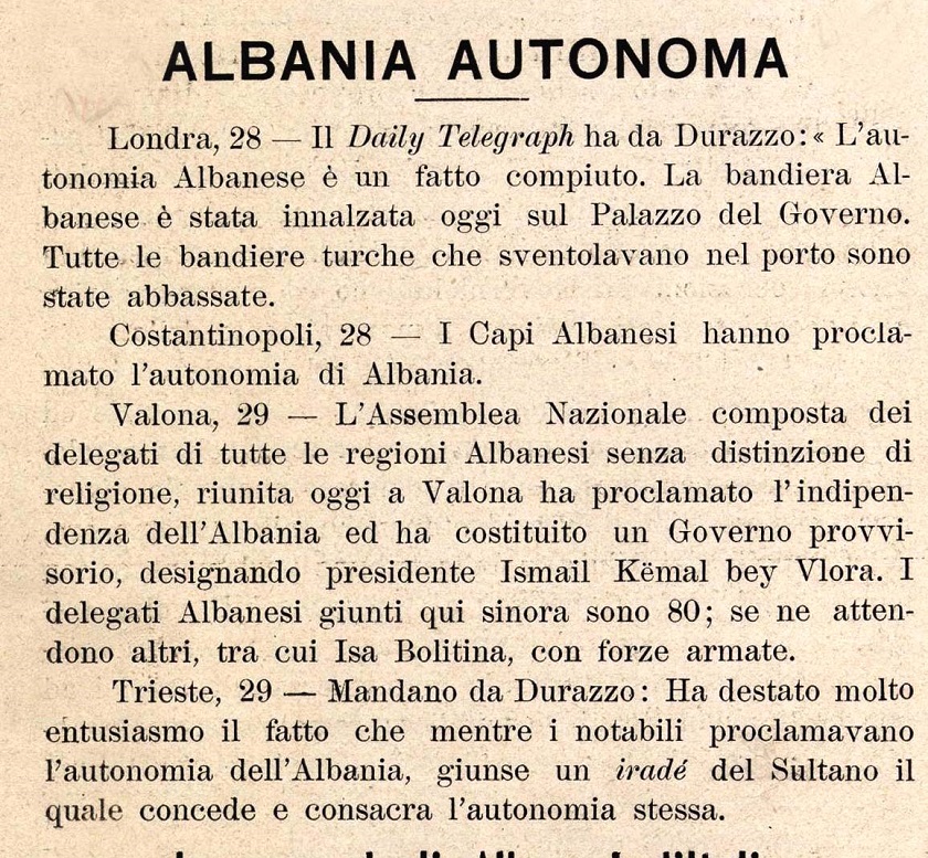 nëntorit 1912. Njoftohet se Shqipëria shpalli autonominë (kur në fakt ishte