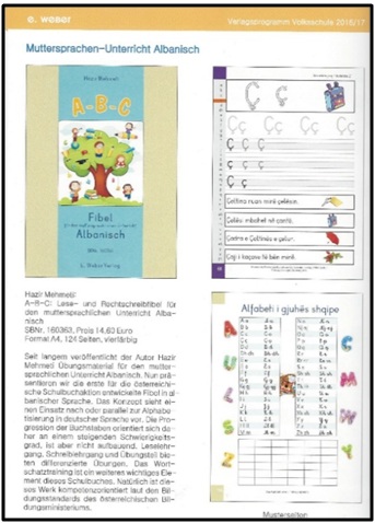 “Pas një pune të gjatë në botimin e materialeve mësimore të autorit Hazir Mehmeti, tani ju prezantojmë Abetarën për mësim të nxënësve me mësim në gjuhen shqipe në Austri. Koncepti bazohet në alfabetizimin në gjuhëb shqipe paralel me gjuhën gjermane.