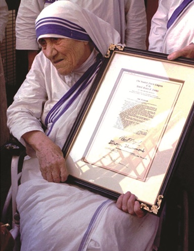 Në foto, 5 qershori, 1997, Nënë Tereza falënderon udhëheqësit e Kongresit për nderimin,
