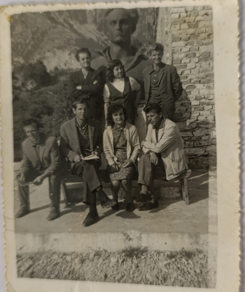 të shkollës 8 vjeçare Halim Xhelo, Tërbaç, para bustit të mësuesit hero,1974