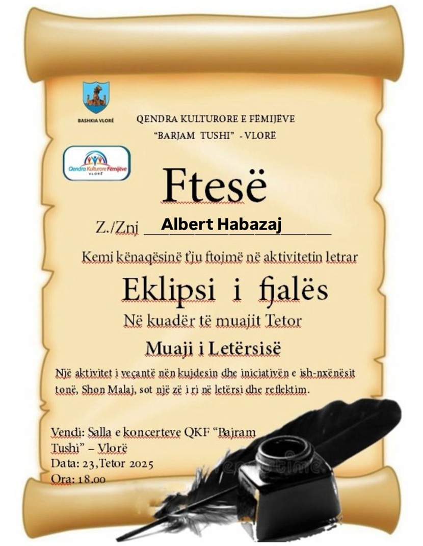 Kumtesë në aktivitetin letrar “Eklipsi i fjalës”, organizuar nga Qendra Kulturore e fëmijve “Barjam Tushi” Vlorë në kuadrin e muajit Tetor si muaj i Letërsisë dhe Artit