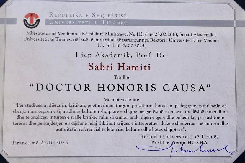 Sabri Hamiti: Fjala në ceremoninë e marrjes së titullit Doctor Honoris Causa në Universitetin e Tiranës