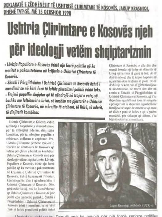 Ky është një dokument me vlera të mëdha historike dhe jo vetëm. Si çdo dokument historik, edhe ky është produkt i një konteksti dhe situate të caktuar. Ka qenë qershori i vitit 1998. UÇK-ja ishte bërë forcë ushtarake, e cila tanimë nuk mund të injorohej as në rrafshin luftarak e as në atë diplomatik. Në këtë situatë Serbia kishte ndezur të gjithë motorët e propagandës për ta diskredituar atë në rrafshin ndërkombëtar, duke e paraqitur si organizatë me bazë ideologjike fundamentalizmin islamik. Kjo deklaratë e zëdhënësit të UÇK-së, Jakup Krasniqit, është kundërvënie ndaj kësaj propagande. Vlera e saj nuk është më vetëm historike. Është edhe aktuale, sepse propaganda e Serbisë vazhdon me të njëjtat metoda, tash kundër kujtesës së UÇK-së. Me një dallim: derisa dje këtë propagandë e bënin kryesisht mediat dhe mekanizmat diplomatikë të Serbisë, sot këtë punë po e kryejnë veglat vahabiste të Serbisë në Kosovë.