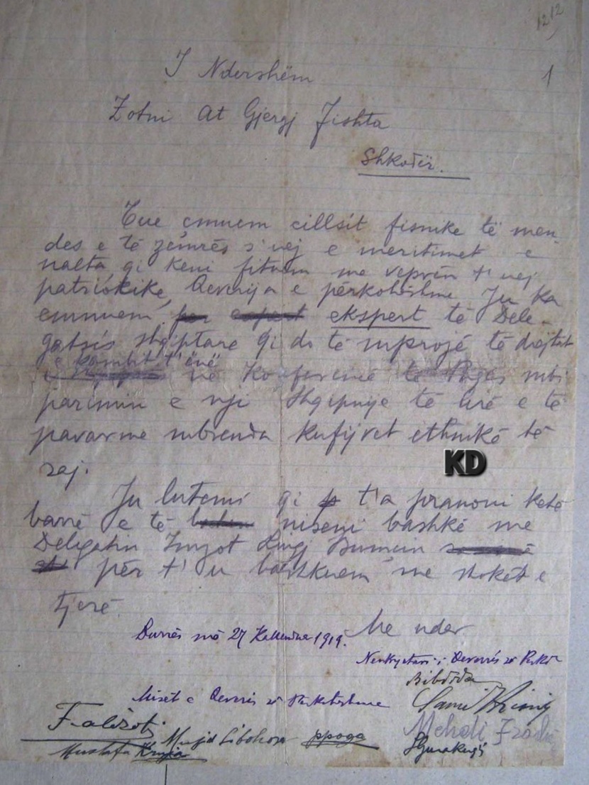 Lutja e qeverisë së Durrësit, datë 27.1.1919, drejtuar Atë Gjergj Fishtës për pjesëmarrjen e tij në delegacionin shqiptar në konferencën e paqes. Nënshkruar nga zëvendëskryeministri Preng Bibë Doda dhe ministrat Fejzi Alizoti, Mehdi Frashëri, Mustafa Kruja, Mufit Libohova, Petro Poga, Luigj Gurakuqi, Mehdi Frashëri, Sami Vrioni. Vlerësohej cilësia patriotike e Atë Fishtës, mendja dhe zemra e tij. Sigurisht, ai iu përgjigj ftesës dhe e pëfaqësoi vendin me dinjitet e krenari.