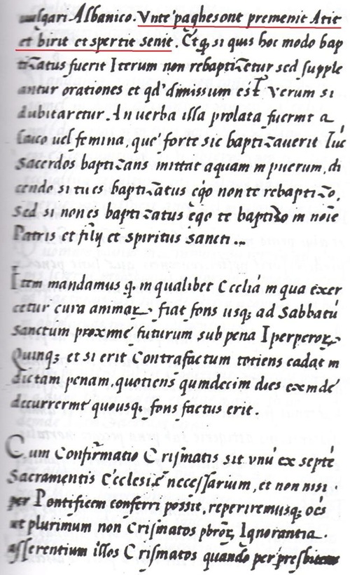 “Formula e pagëzimit” është një tekst i shkurtër ritual që përmban fjalët me të cilat prifti pagëzon një fëmijë kur nuk ka kohë për një ceremoni të plotë kishtare. Në versionin e shkruar nga Pal Engjëlli, formula është: “Un’të paghesont’ pr’emenit t’Atit e t’Birit e t’Shpertit Senit.” (Në shqipen e sotme: “Unë të pagëzoj në emër të Atit, të Birit dhe të Shpirtit të Shenjtë.”) e, pra, semantikisht, fjalia është një akt gjuhësor fetar: përmes shqiptimit të saj, kryhet një veprim real, pagëzimi. Fjalët nuk janë vetëm përshkruese, por vepruese (performative), siç thotë filozofi i gjuhës J.L. Austin. Në planin gjuhësor, pra, formula paraqet një formë të hershme të shqipes së shkruar, me tipare fonetike dhe morfologjike të periudhës mesjetare. Folja “paghesont” (të pagëzoj) paraqet ndikime të latinishtes kishtare baptizo, ndërsa parafjalët “pr’emenit” dhe “t’Shpertit Senit” tregojnë shkurtime e trajta dialektore të kohës. Struktura e fjalisë është e qartë dhe lineare, duke ndjekur rendin logjik të një akti fetar.
