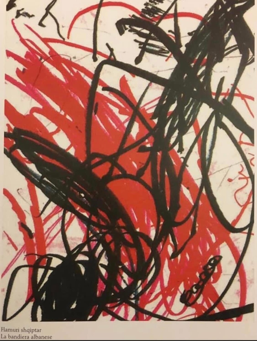E kemi treguar, kur Atjoni ishte tre vjeç e gjysmë bëri flamurin më të çuditshëm, më të shqetësuarin që kishim parë si me fije të ngatërruara vetëtimash, mpleksur me fije të zeza nate, ndërkaq luftohej në Kosovë dhe ai dëgjonte bisedat tona dhe lajmet televizive bashkë me ne, na shihte që tronditeshim, prandaj dhe doçkat fëminore krijuan atë “Flamurin shqiptar” - siç tha me zë të druajtur. Po ç’është ai kaos ashtu, ç’ndillte ai flamur nervoz, pabesueshëm i çoroditur?