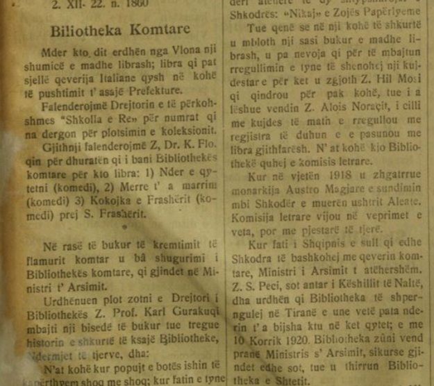 Në numrin 56 të datës 10.12.1922, "Fletorja zyrtare" njoftonte se ishte përuruar në Tiranë, brenda Ministrisë së Arsimit, Biblioteka Kombëtare. Profesor Karl Gurakuqi ishte emëruar më 9.6.1922 drejtor i Bibliotekës së Shtetit. Kjo bibliotekë ishte formuar fillimisht në Shkodër më 16.4.1917 me urdhër të drejtorit të përgjithshëm të Arsimit në Shkodër, Luigj Gurakuqi, kur u krijua bërthama e parë e bibliotekës e quajtur e komisisë letrare, e cila njohu si mbikëqyrës Hilë Mosin e më pas Luigj Naraçin. Më 10.7.1920, ministri i Arsimit, Sotir Peci, urdhëroi që biblioteka të shpërngulej në Tiranë pranë Ministrisë së Arsimit. Njoftimi bënte të ditur se biblioteka kishte 6 mijë vëllime. Njoftohej se kontribute kishin dhënë për pasurimin e bibliotekës, qeveria franceze, kolonitë shqiptare në Rumani dhe Mit'hat Frashëri.