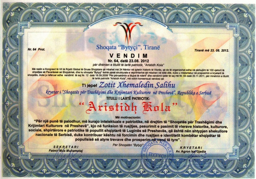 Titullin e Lartë Patriotik “Aristidh Kola”, për një punë të palodhshme me