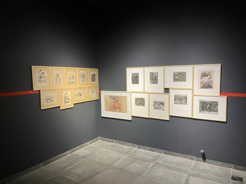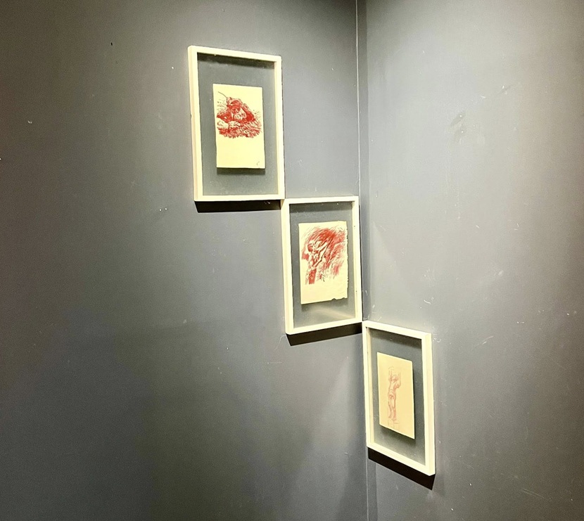 Grafika të kornizuara në murin këndor strukturojn një sistem modular ku grafikat e vogla në dimensione  dhe mesatare formojnë një rrjet leximi, një fushë imazhesh që mbështjellin një histori fragmentare. Çdo grafikë, me nuancat e saj të gërvishtjeve, etsheve dhe hijeve, sillet si stigma , gjurmë të një procesi vizual , ku ripërsëritja e formatit dhe mbivendosja përforcojnë idenë e kujtesës si palimpsest. Iluminimi i drejtuar krijon pika fokale ku plani i punës del nga errësira, këto njolla drite aktivizojnë lexime metafizike, drita si moment i zbulesës, si indeksi i pranisë. Drita e Prometheut, zjarri i tij, forca e përjetësisë, pra zotësia,  çveshja e vlerave dhe vazhdimi i krijimit si shkak pasojë i dritës. Dritë jep jetë, është përtej artit rrugëtimi i artit drejt dritës ngacmojnë ndjenjnë e krjimit, siç kishte me thënë Friedrich Nietzsche “Froca krijuese është drejt rrugës së shpirtit”. Figuracionet e grafikave figura, skena të brendshme, trupa apo peizazhe të vogla dialogojnë me idenë e personazheve vuajtës që përshkruhen në tekstin origjinal, figura si shpërthime afektive brenda një fushe të mbushur me heshtje.