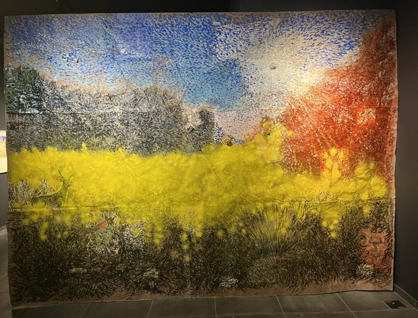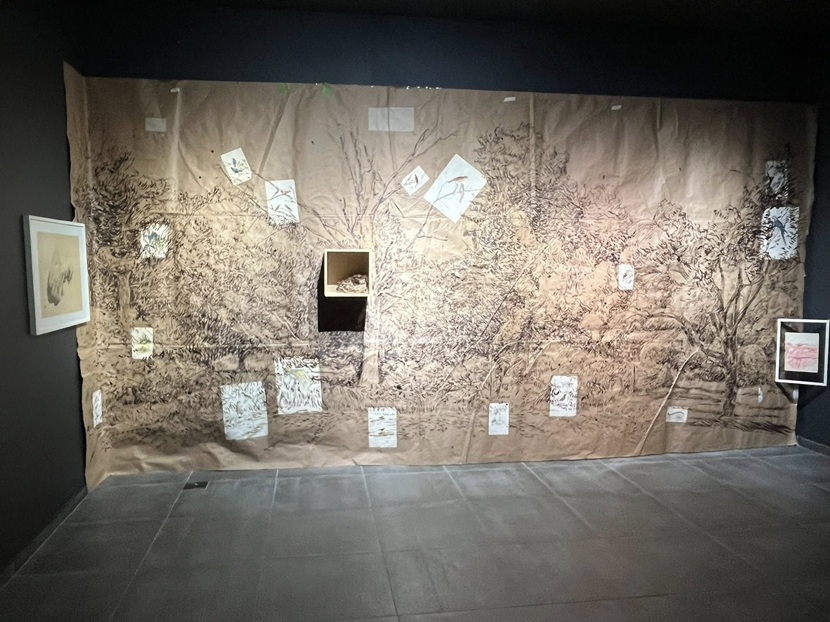 Murali i madh në letër kraft, i kombinuar me kollazhe skicash dhe një kub druri, funksionon si një peizazh i brendshëm: monumental në shkallë, por intim në mënyrën e ndërtimit. Letra kraft, me strukturën e saj të papërsosmërisë dhe ngjyrën e ngrohtë, shërben si substrat arkivor një fushë e hapur ku përmbajtja realizohet si grafika çizimore dhe si një topografi e mbivendosur e kujtimeve. Linjat e dendura të vizatimit krijojnë një perspektivë që referon më shumë në trup dhe interior sesa në pamjen e jashtme; druri, shtresimet dhe ritmi i gërvishtjeve bëhen tregues të kohës. Elementët e kolazhuar   fletë të vogla të ngjitura, skica të pavarura dhe një kuti druri e transformuar në “arkë”   prodhojnë efektin e një ekskavacioni: fragmente të ndara të përvojës manifestohet si prova materiale.
