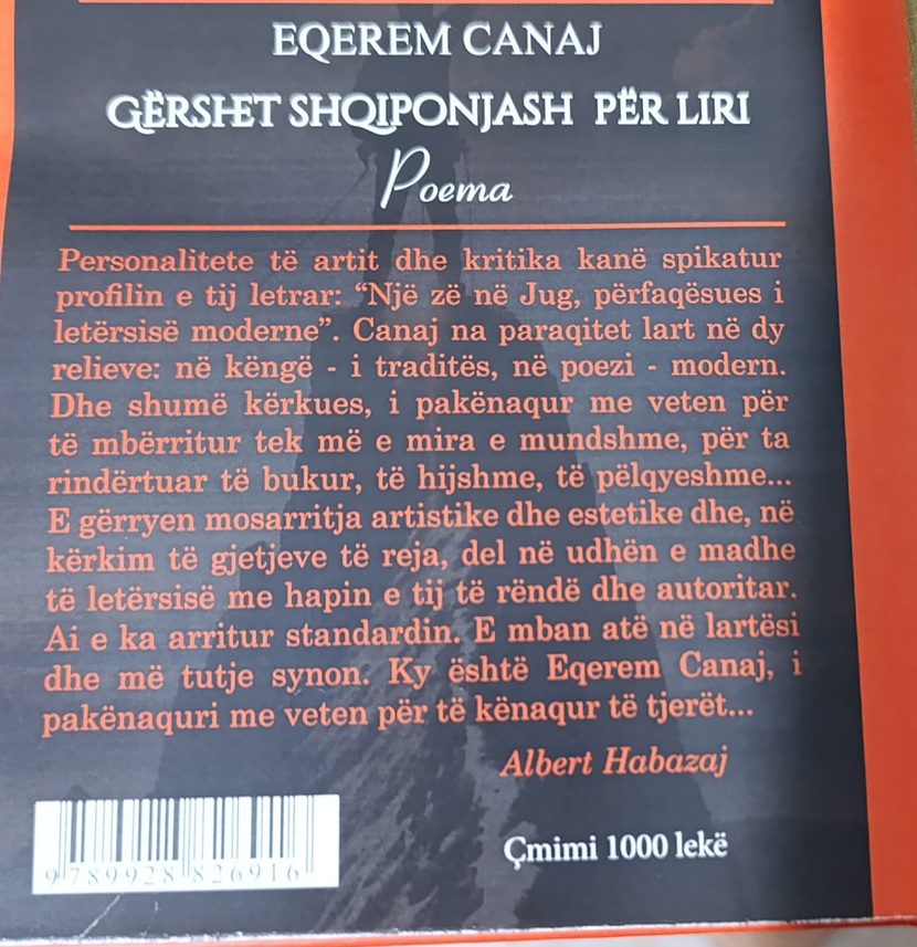 Ndër kolegët e sotëm të Vlorës (që ushtrojnë të shkruarit letërsi mbas viteve 1990), E. Canaj është i pari dhe ndoshta unikal që ndërton një libër vetëm me poema. Ja, ky është Eqerem Canaj - notari i paepur në lumin e letërsisë së tij, që në një libër me 12 poema thuri “gërshet shqiponjash për liri”.