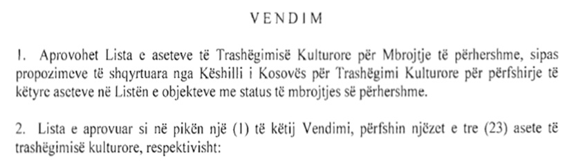 Vlen te ndriçohet fakti se në çdo dosje ishte vendimi origjinal i monumentit që objekti me vlera kulturore ishte nën mbrojtje të shtetit.