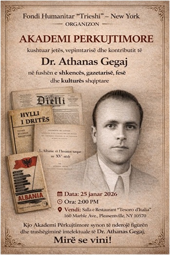 Ndërkaq, jeta dhe veprimtaria e Dr Athanas Gegaj, ish-Editor i gazetës Dielli për më shumë se një dekadë, do të jetë në qëndër të diskutimeve nga disa ekspertë, njohës të mirë të Dr Gegajt, Search Results for “dr athanas gegaj” – Dielli | The Sun -- më 25 Janar 2026 në Akademinë Përkujtimore, titulluar:  “Athanas Gegaj - shembull i patriotizmit, shkencës dhe publicistikës”.  Njoftohet se Fondi Humanitar “Trieshi” në Nju Jork, organizon këtë aktivitet të veçantë për të nderuar veprimtarinë dhe kontributin e Athanas Gegajt – malësorit nga Trieshi i Malësisë Madhe -- në fushën e shkencës, gazetarisë, fesë e kulturës shqiptare. Kjo akademi përkujtimore do t’i kushtohet, pra, pikërisht Athanas Gegajt, birit të Trieshit, një prej personaliteteve më të rëndësishme jo vetëm të Malësisë së Madhe, por edhe të mbarë botës shqiptare. Sipas njoftimit të Fondit Humanitar, “Trieshi”, ai tubim do të trajtojë, në mënyrë të plotë, veprimtarinë e Dr Athanas Gegajt, duke vlerësuar -- përveç dy veprave të tij të rëndësishme shkencore -- edhe rolin e tij të rëndësishëm si editor i gazetës Dielli në Boston të Shteteve të Bashkuara dhe bashkëpunëtor i ngushtë më heret i revistës françeskane, Hylli i Dritës, në Shqipëri. Duke pasqyruar, gjithashtu edhe angazhimin e tij politik në mërgim dhe bashkëpunimin me figura të njohura shqiptare, si dhe kontributin e tij fetar si klerik françeskan dhe krijimtarinë e tij të gjërë publicistike.