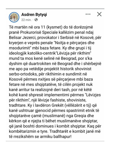 Së fundmi, avokati Asdren Bytyqi, duke dalë haptazi jashtë rolit profesional të avokatit, ka zgjedhur të përdorë institucionet e drejtësisë jo për mbrojtjen e ligjit, por si instrument presioni politik dhe ideologjik kundër intelektualëve shqiptarë që mendojnë ndryshe.
