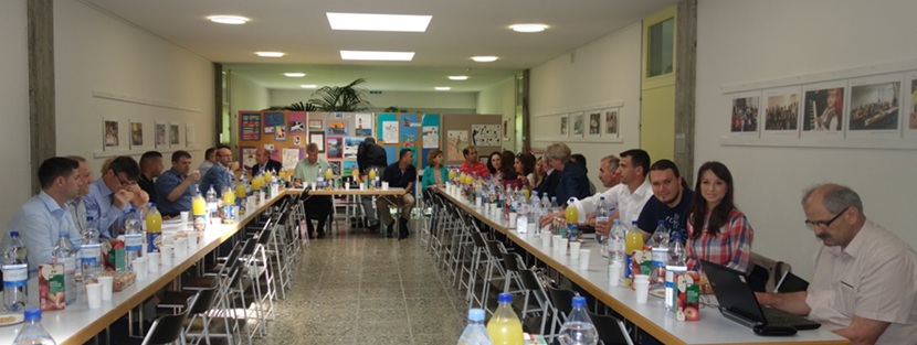 Pamje para fillimit të Kuvendit, djathtas me syza Z. Nuhi Gashi, përfaqësues nga MASHT të R. Kosovës, pranë mësuesja e bashkisë Derndingen, kantoni Solothurn, Z. Arbresha Ibraimi dhe pranë Artan Ibraimi, mysafir, 2013-06-09.