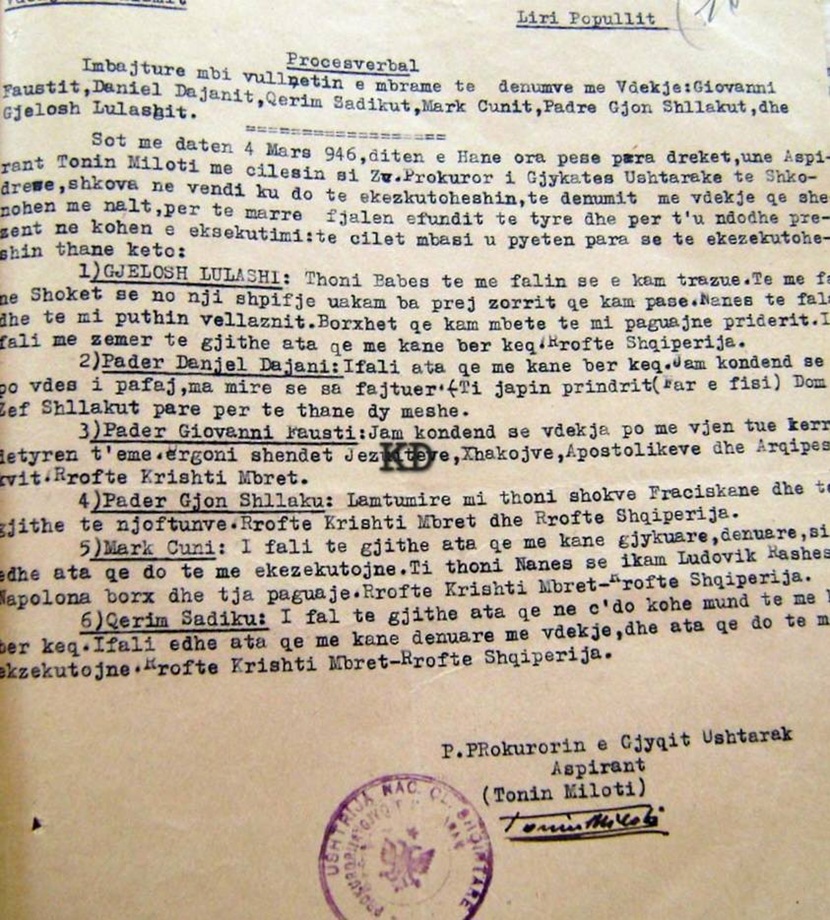 4.3.1946 u pushkatuan: Atë Daniel Dajani, Atë Giovani Fausti, Atë Gjon Shllaku,