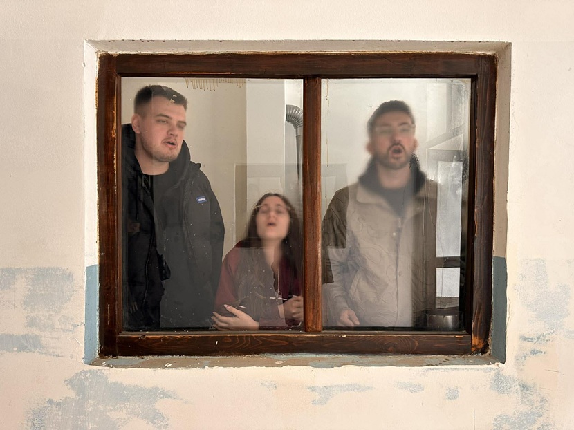 Në një nga momentet më të heshtura, por më të ngarkuara të projektit, studentët e UBT u tërhoqën në dhoma të vogla, pothuajse të mbyllura ndaj botës. Trupat e tyre nuk lëviznin shumë, por fryma ajo bëhej gjuhë. Të ngujuar në hapësira të ngushta, ata iu afruan xhamit si një kufi i tejdukshëm mes brendësisë dhe jashtësisë. Me çdo nxjerrje fryme, xhami avullohej ngadalë. Një mjegull e lehtë mbulonte sipërfaqen, si një shenjë e padukshme që bëhej e dukshme vetëm për pak çaste, për t’u zhdukur sërish.Ishte një akt i thjeshtë, por i thellë: fryma si dëshmi e pranisë. Një përpjekje për të lënë gjurmë në një sipërfaqe që nuk mban asgjë gjatë. Një dialog i heshtur mes trupit dhe materialit, mes të përkohshmes dhe dëshirës për të mbetur.