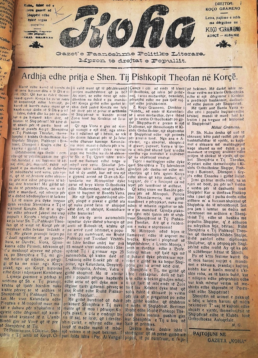 “Kurrë dhe kurrën e kurrën të mos harrohet 9 dhjetori 1921”-shkruan gazeta “Koha” e Mihal Gramenos, dita kur për të parën herë shkeli në Korçë shenjtëria e tij peshkopi Theofan, themelues i Kishës Ortodokse Autoqefale Shqipe, peshkopi i Bostonit, dhespot i Krujës dhe eksaku i gjithë lirisë. Sipas gazetës, populli i Korçës, pasi përzuri Jakovin, i telegrafoi peshkopit Theofan, të cilin e priti në Vlorë një komision i kryesuar nga Llambi Bimbli. Në korçë i pari foli Atë Vangjel Çamçe në emër të 50 priftërinjve të rinj, i cili i premtoi mirëseardhjen, besnikëri e përunjësi. Koço Grameno, drejtor i “Kohës” foli në emër të katundarisë; në mitropoli foli kryetari i pleqësisë Llambi Mborja dhe profesor Sotiri. Banda muzikore e “Vatrës” ishte po ashtu e pranishme. Noli predikoi bashkim, dashuri dhe punë për Shqipërinë.
