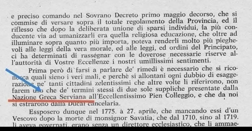 Shprehja italiane "Nazione Greca Serviana" është shumë domethënëse dhe duhet kuptuar në kontekstin historik të shek. XVIII, jo me kuptimin modern të "kombit"