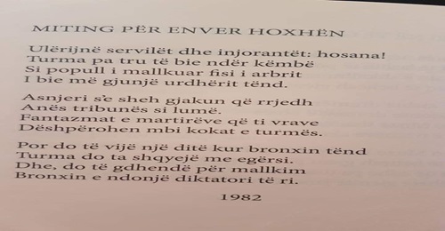 “Miting për Enver Hoxhën” është një poezi politike, të cilën e ka shkruar Frederik Rreshpja dhe tingëllon sikur të jetë shkruar sot në Kosovë."Ulërijnë servilët dhe injorantët: hosana!Turma pa tru të bie ndër këmbë" -thotë poeti.Rreshpja në këtë poezi më tej thotë se do të vijë një ditë, kur despoti do të bie, siç ka rënë Hoxha...
