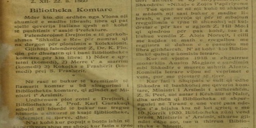 Në numrin 56 të datës 10.12.1922, "Fletorja zyrtare" njoftonte se ishte përuruar në Tiranë, brenda Ministrisë së Arsimit, Biblioteka Kombëtare. Profesor Karl Gurakuqi ishte emëruar më 9.6.1922 drejtor i Bibliotekës së Shtetit. Kjo bibliotekë ishte formuar fillimisht në Shkodër më 16.4.1917 me urdhër të drejtorit të përgjithshëm të Arsimit në Shkodër, Luigj Gurakuqi...